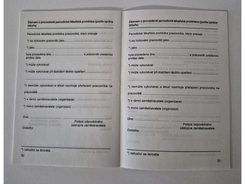 Formát A6, 48 stran - zápisník zahrnuje veškeré záznamy o Instruktážích, prohlídkách a záležitostech spojených s bezpečností práce, jednotlivého zaměstnance.